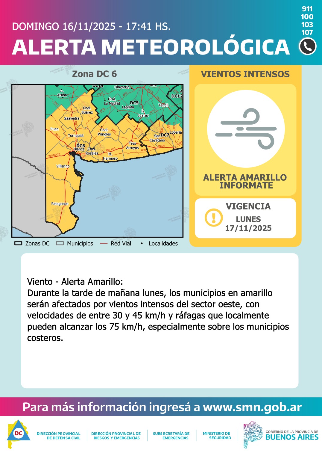 Descripción de alerta amarilla por vientos – Lunes 17 – Zona DC 6 y oeste de la zona DC 7