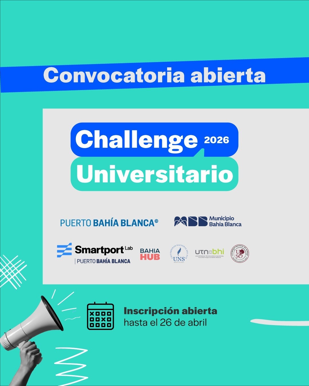 El Puerto de Bahía Blanca, a través de SmartPortLab, junto al Municipio de Bahía Blanca, la Universidad Nacional del Sur, la Universidad Tecnológica Nacional – Facultad Regional Bahía Blanca y la Universidad Provincial del Sudoeste (UPSO), lanzaron las inscripciones para el Challenge Universitario 2026, una iniciativa que busca acercar el talento académico al entramado portuario–industrial de la región.