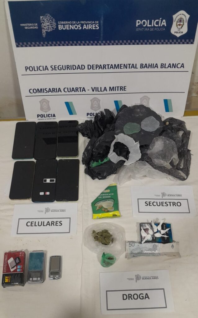 Se secuestraron seis teléfonos celulares, dos balanzas digitales, distintos nylons con faltantes circulares, 6,7grs de Marihuana, 7 bochas de Cocaína con un total de 3,9grs, un billete con 1,2grs y elementos de fraccionamiento y estiramiento de estupefacientes.