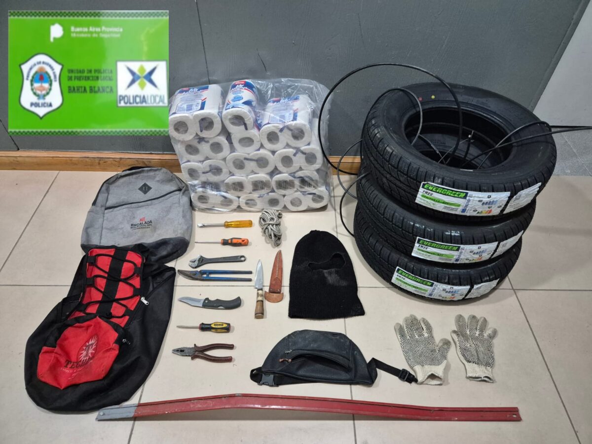 Durante la requisa, los uniformados encontraron entre sus pertenencias herramientas utilizadas para el ilícito: una tijera de cortar chapa, una llave francesa, varios destornilladores, una soga, un par de guantes, un pasamontaña, tramos de cable coaxial, una navaja y un cuchillo.
