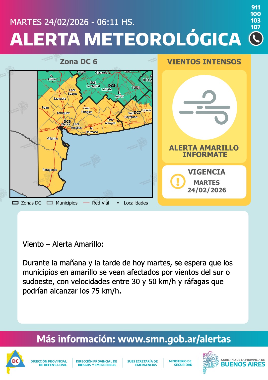 Durante la mañana y la tarde de este martes, se espera que los municipios en amarillo se vean afectados por vientos del sur o sudoeste, con velocidades entre 30 y 50 km/h y ráfagas que podrían alcanzar los 75 km/h.