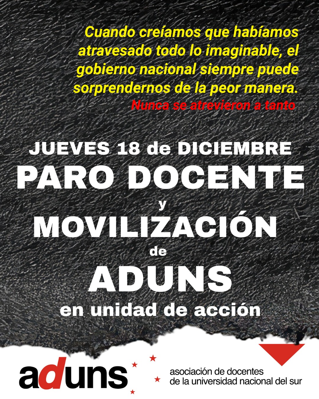 Frente a todo este panorama y atendiendo que mañana comenzará a tratarse la Ley de Reforma Laboral, “que echa por tierra históricas conquistas del pueblo trabajador, desde ADUNS, resolvemos PARAR por 24 hs. el jueves 18 de diciembre y participar, en Bahía Blanca de la movilización que protagonizaremos, junto a la ASAMBLEA ABIERTA BAHÍA BLANCA, la CGT y otras organización sindicales, políticas y sociales, a partir de las 15 hs. en la esquina del Honorable Concejo Deliberante de nuestra ciudad (Sarmiento y Estomba)”.